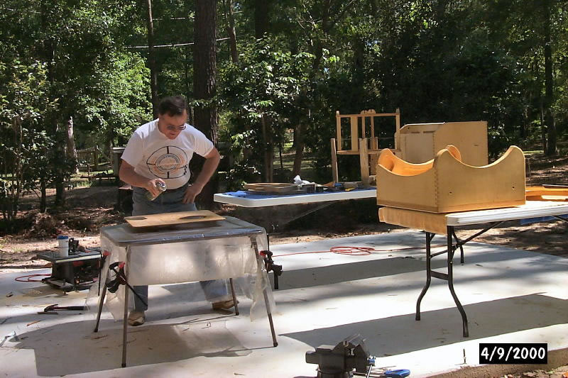 varnish was used to finish all wood components of the TeleKit. I did this to minimize the need for sanding between coats. Spray varnish coats were thinner than brushed on coats of varnish; so additional coats were applied. Seen in the rear is a jig I made out of scrap wood to support the upper assembly during spray varnishing. |