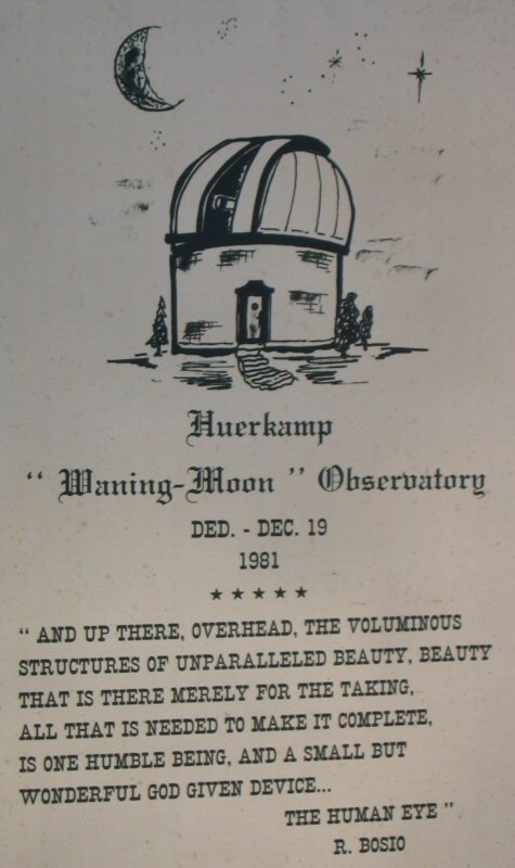 I sold my home in New Orleans East in 1992, and abandoned the 12 1/2' fiberglass domed observatory named Waning Moon I had constructed there. I had neither the time nor the money to remove it. Ever since then, I have wanted another observatory because of the convenience they afford. Not having to move a telescope from inside the house and set it up every time the weather cooperated resulted in more frequent observing sessions.Above is the text from the plaque prepared for the dedication party held on December 19, 1981. They were prepared by Remy Bosio, a long time member of the Pontchartrain Astronomy Society. Below are links to photo albums on the various sets taken to construct Waning Moon. Waning Moon Dome Fiberglass Work Having had the "fun" of building a domed observatory; I have decided to forgo that "pleasure" this time around. Instead, I will be constructing a 12'X16' roll-off roof observatory to house my 8" Classical Cassegrain and Byers 812 mount. Adjacent to the observatory will be a 16'X16' paved observing area with 9' tall light baffle walls. It will be used for observing with my 17.5" AstroSystems TeleKit containing a 1981 vintage Coulter primary. The light baffle walls are necessary even though the nearest neighbor's house is over 300' away. Invariable tthey turn on all of their outside lights whenever the skies clear up and I take out a scope. Waning Moon's dedication plaque will be hung in Waning Moon II. |