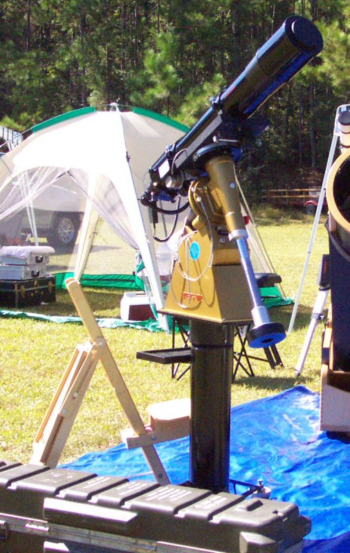 Below are a few of pictures of my equipment and astronomical objects of interest. 6"f/8 CELESTRON REFRACTOR ON BYERS 812 This is my Celestron 6" f/8 refractor, containing an achromatic objecive. The scope and mount that comes with the Celestron CR150HD is made by Synta of China. The CG-5 mount has been replaced as the legs supplied proved to be inadequate to properly support the system. In its place I am using my 1980's vintage Byers 812 mount. The mount rides on a homemade pier composed of 6" Aluminum conduit, University Optics "Lunar Lander" legs, and AstroPhysics stainless steel tension rods. Also, riding on the tube is a homemade 3N1 bracket made from the same conduit as the pier, a Novak counterweight set, and a finderscope bracket made by Ken's Rings and Things. Finally, I have added Digital Setting Circles using 8192 step encoders geared up to 16384 steps and an Argo Navis to help locate objects.