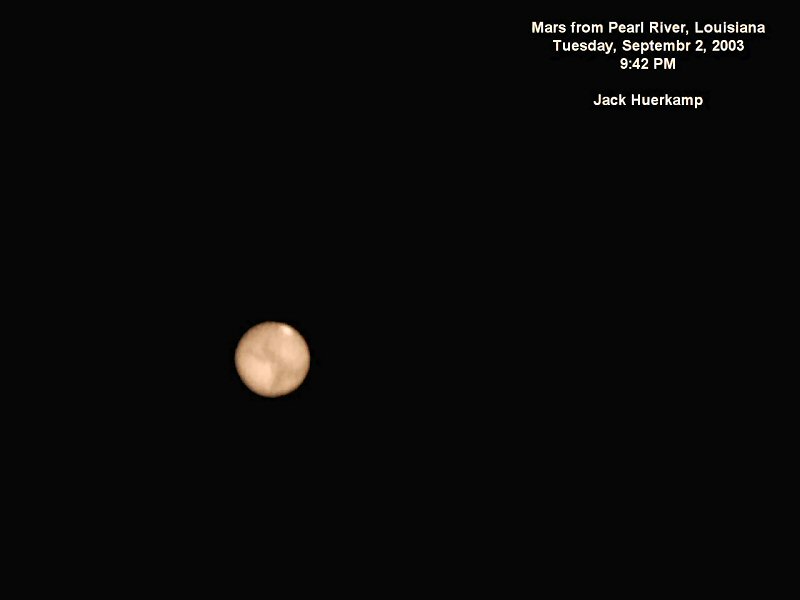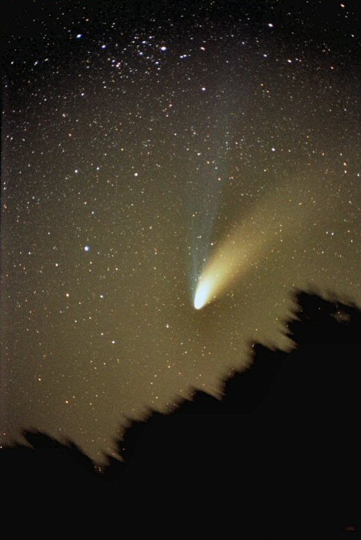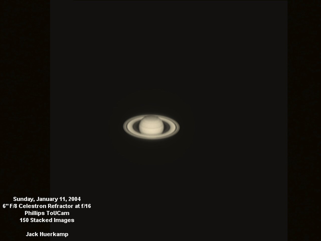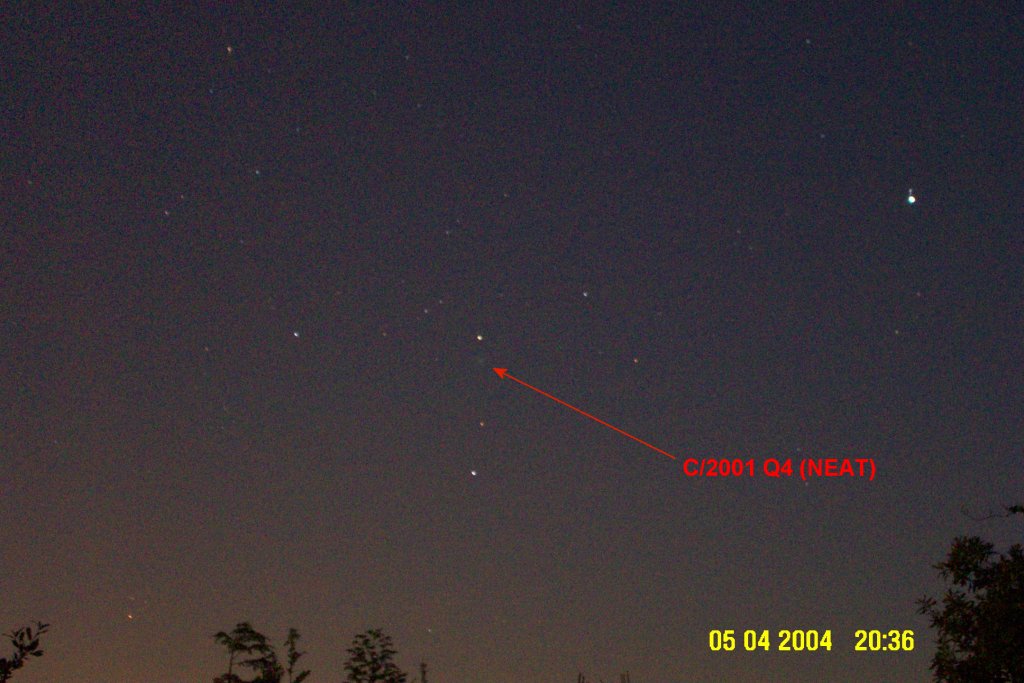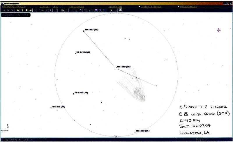 MARS Mars taken through my 6" f/8 refractor on Tuesday, September 2, 2003. A Phillips ToUCam, Sirius Optics Minus Violet Beta filter, Sirius Optics Planetary Contrast filter, and Televue Big Barlow were used to obtain the AVI sequence. The picture is a stacking of 20 images using Registax. SATURN Saturn taken on Sunday, January 11, 2004 I used my Phillips ToUCam and the Celestron refractor pictured above to take this photograph. I added a TeleVue 2X Big Barlow to the scope to change it to f/16. The ToUCam was set to record 5 frames per second, and I used the image on the laptop to adjust focus, brightness, gain and hue. I recorded several 30 second AVI files (150 images), deleted the audio track using VirtualDub, and then stacked all images using Registax. I did not individually pick the frames to stack. If I had eliminated the fuzzy frames, the finished stacked image would be clearer. However, clearly seen in the photo is Casini's Division all the way aroung the rings until it disappears behind the planet. Encke's minima/division is seen along with the Crepe Ring in front of and on either side of the planet. Also seen is the shadow of the planet projected on the ring. NOTE: the original image was saved as a TIFF. I converted the file to a JPG in order to be able to post it to this webpage. In the conversion some of the finer detail was lost. In the above photo, I inadvertently failed to utilize the "color" option when registering and stacking the AVI file. Below is the same AVI file re-registered and stacked with the "color" box checked. COMET HYAKUTAKI Comet Hyakutaki taken piggy backed on my Celestron 8.An Olympus OM-1 and 150mm Lens at f/4 were used along with Fujicolor ASA1600 film to take this 8 minute exposure. COMET HALE-BOPP Comet Hale-Bopp taken piggy backed on my Celestron 8An Olympus OM-1 and 75mm Lens at f/4 were used along with Fujicolor ASA800 film to take this 4 minute exposure. Comet C/2002 T7 LINEAR - February 8, 2004 A large contingent of PAS members ventured to the Girl Scout Camp in Independence, Louisiana on the night of Saturday, February 8, 2004. The skies cooperated and we were able to show those in attendance T7. I first spotted it at 6:30 PM, over 30 minutes before the end of astronomical twilight. As twilight ended, the comet's appearance improved and at 6:43 PM, I made the sketch below. Comet C/2001 Q4 (NEAT) - April 4, 2004 Comet C/2001 Q4 (NEAT) as photographed by a Koday DC 4800 digital camera. The camera was set at f/2.8 and ASA 400. The shutter was opened for 16 seconds. Despite stong moonlight, the comet can faintly be seen below Wezen. November 8, 2003 Total Lunar Eclipse Pre-Totality Sequence Totality and Post-Totality