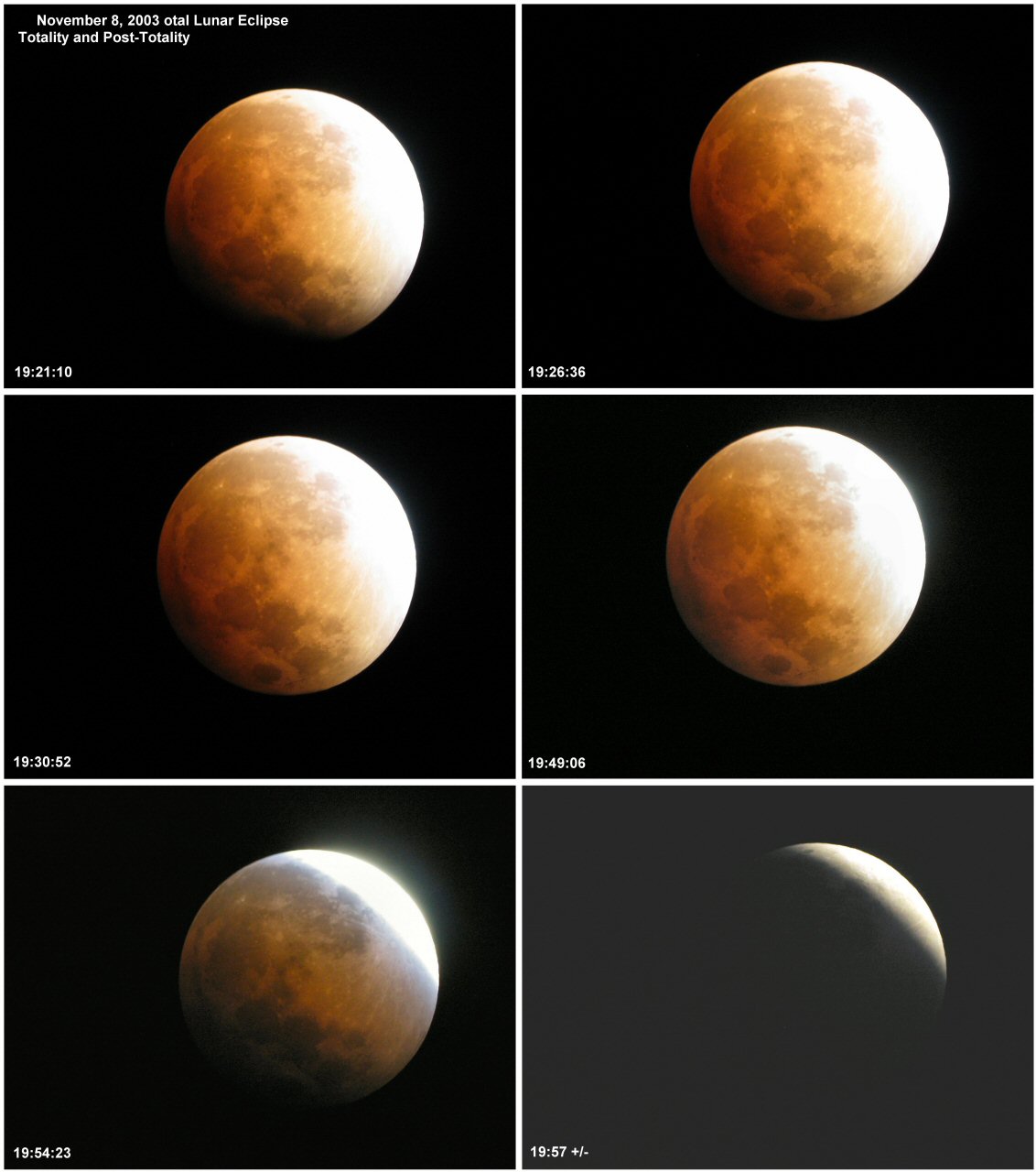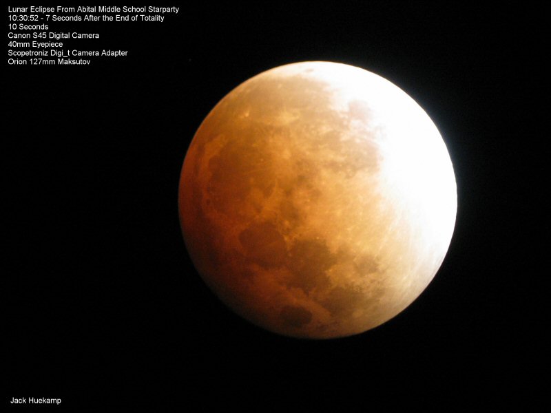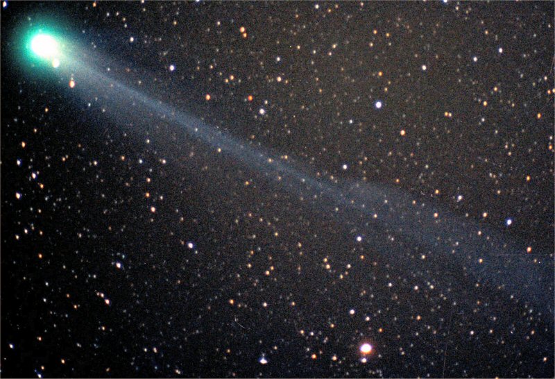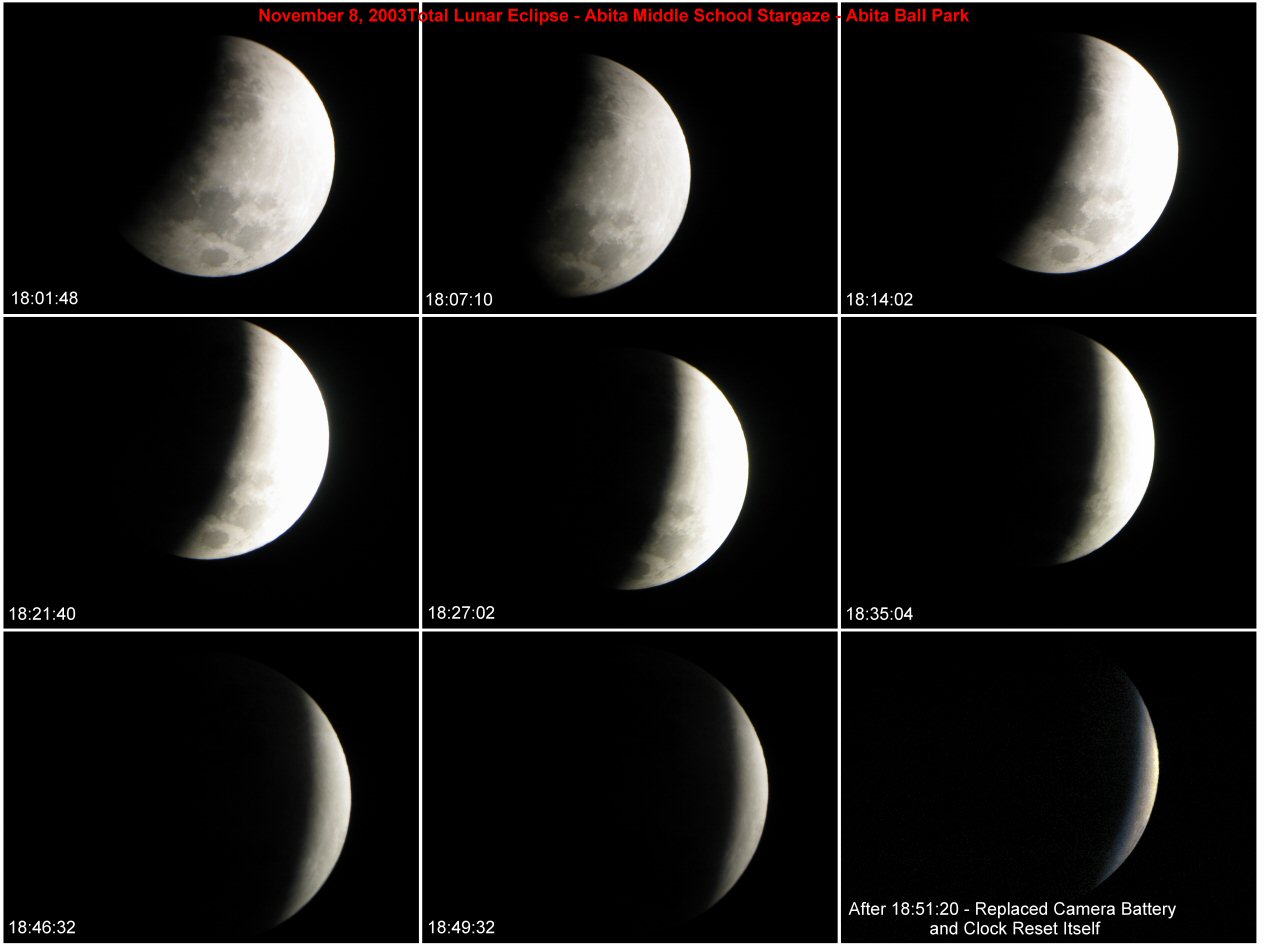 MARS Mars taken through my 6" f/8 refractor on Tuesday, September 2, 2003. A Phillips ToUCam, Sirius Optics Minus Violet Beta filter, Sirius Optics Planetary Contrast filter, and Televue Big Barlow were used to obtain the AVI sequence. The picture is a stacking of 20 images using Registax. SATURN Saturn taken on Sunday, January 11, 2004 I used my Phillips ToUCam and the Celestron refractor pictured above to take this photograph. I added a TeleVue 2X Big Barlow to the scope to change it to f/16. The ToUCam was set to record 5 frames per second, and I used the image on the laptop to adjust focus, brightness, gain and hue. I recorded several 30 second AVI files (150 images), deleted the audio track using VirtualDub, and then stacked all images using Registax. I did not individually pick the frames to stack. If I had eliminated the fuzzy frames, the finished stacked image would be clearer. However, clearly seen in the photo is Casini's Division all the way aroung the rings until it disappears behind the planet. Encke's minima/division is seen along with the Crepe Ring in front of and on either side of the planet. Also seen is the shadow of the planet projected on the ring. NOTE: the original image was saved as a TIFF. I converted the file to a JPG in order to be able to post it to this webpage. In the conversion some of the finer detail was lost. In the above photo, I inadvertently failed to utilize the "color" option when registering and stacking the AVI file. Below is the same AVI file re-registered and stacked with the "color" box checked. COMET HYAKUTAKI Comet Hyakutaki taken piggy backed on my Celestron 8.An Olympus OM-1 and 150mm Lens at f/4 were used along with Fujicolor ASA1600 film to take this 8 minute exposure. COMET HALE-BOPP Comet Hale-Bopp taken piggy backed on my Celestron 8An Olympus OM-1 and 75mm Lens at f/4 were used along with Fujicolor ASA800 film to take this 4 minute exposure. Comet C/2002 T7 LINEAR - February 8, 2004 A large contingent of PAS members ventured to the Girl Scout Camp in Independence, Louisiana on the night of Saturday, February 8, 2004. The skies cooperated and we were able to show those in attendance T7. I first spotted it at 6:30 PM, over 30 minutes before the end of astronomical twilight. As twilight ended, the comet's appearance improved and at 6:43 PM, I made the sketch below. Comet C/2001 Q4 (NEAT) - April 4, 2004 Comet C/2001 Q4 (NEAT) as photographed by a Koday DC 4800 digital camera. The camera was set at f/2.8 and ASA 400. The shutter was opened for 16 seconds. Despite stong moonlight, the comet can faintly be seen below Wezen. November 8, 2003 Total Lunar Eclipse Pre-Totality Sequence Totality and Post-Totality