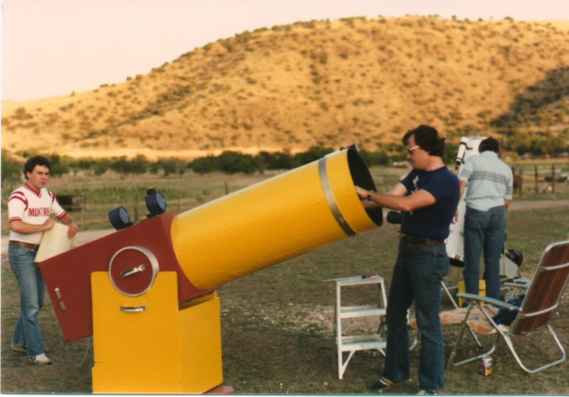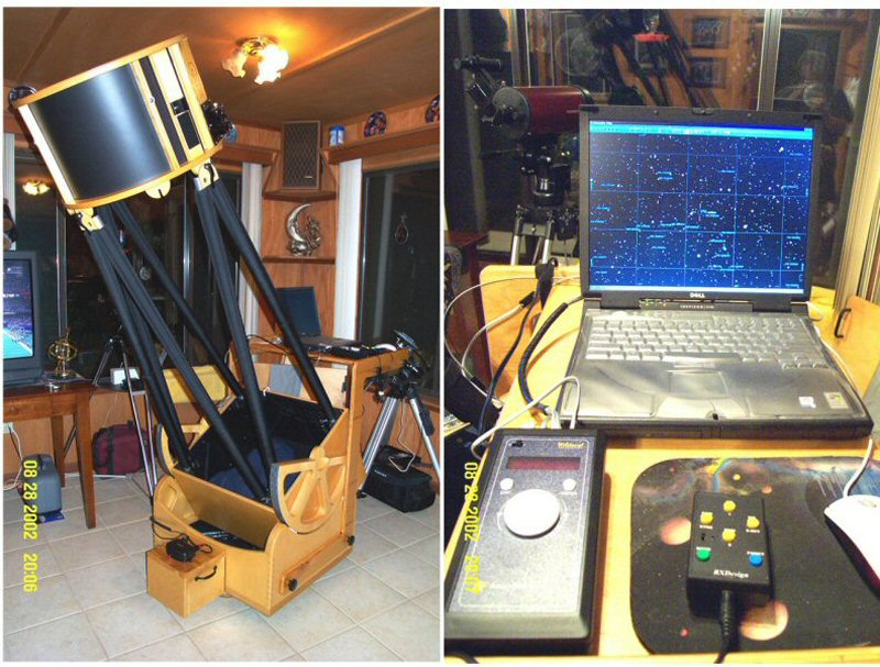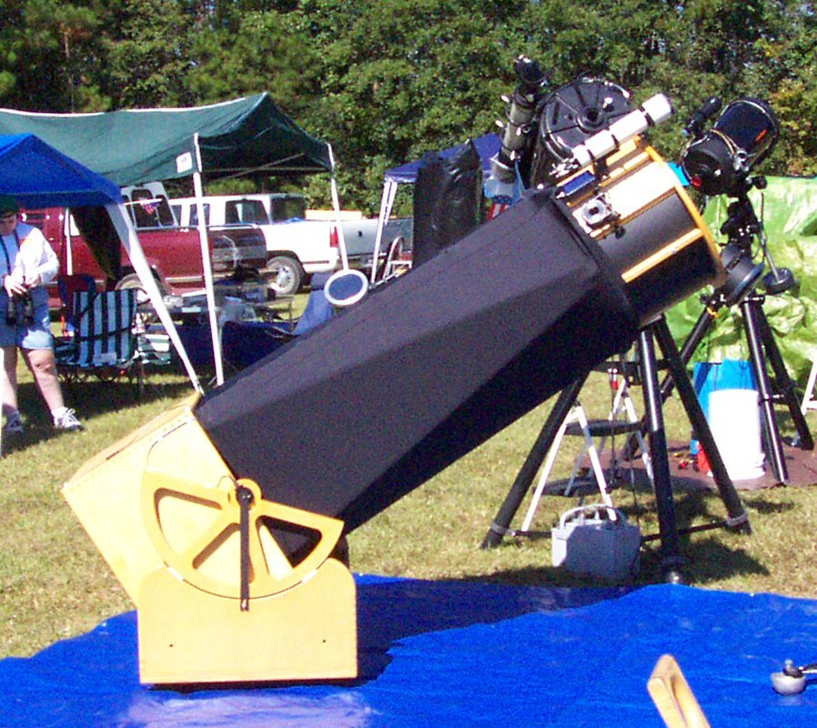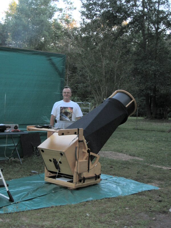 17.5" ASTROSYSTEMS TELEKIT WITH COULTER MIRROR This is my original 17.5" Dobsonian. The mirror was purchased from Coulter Optical in 1980 and spent the first 20 years in the heavy, conventional Dob seen below. The tube was 3/8" solid fiberglas, and the altitude bearings were made from a piece of 12" aluminum conduit. 3/4" plywood was used for most of the construction, with several components being double thickness. The groundboard was made of double thickness 1" plywood and the mirror cell sat on a single thickness of the same plywood. There was nothing light about this scope! The only commercial components used on the scope were Novak secondary holder, spider and focuser. The finder (8X50) came from Meade. All other parts were fabricated by me and several members of the PAS. Also seen on top ot the tube box is my Coulter CT-100 - a 4.25" f/3.5 reflector that I used as a wide field finder. I still have this scope and use it regularily. As I got older, I needed to find a way to lighten the scope. In 1997, I ordered a TeleKit from AstroSystems to house the Coulter mirror. Over a period of several years, I slowly assembled the kit, and it finally made its debut at the Deep South Regional Stargaze in October of 2001. Since then I have made several modifications to the scope. As seen below, the scope now sports a laptop table and ride along 12 volt power supply. A ServoCAT was the latest addition. This devide adds GoTo and Tracking capabilities to the system. To date I have tracked objects, including comets, at over 400 power - greatly adding to the observing experience. Below is the ServoCAT equiped TeleKit with laptop table, and battery box on the night I first used the CAT. It performed perfectly, centering every object sought in the 100 power field oof view. Becuase of the location of the ServoCAT's altitude drive motor, I needed to modified the table leg to miss it..
